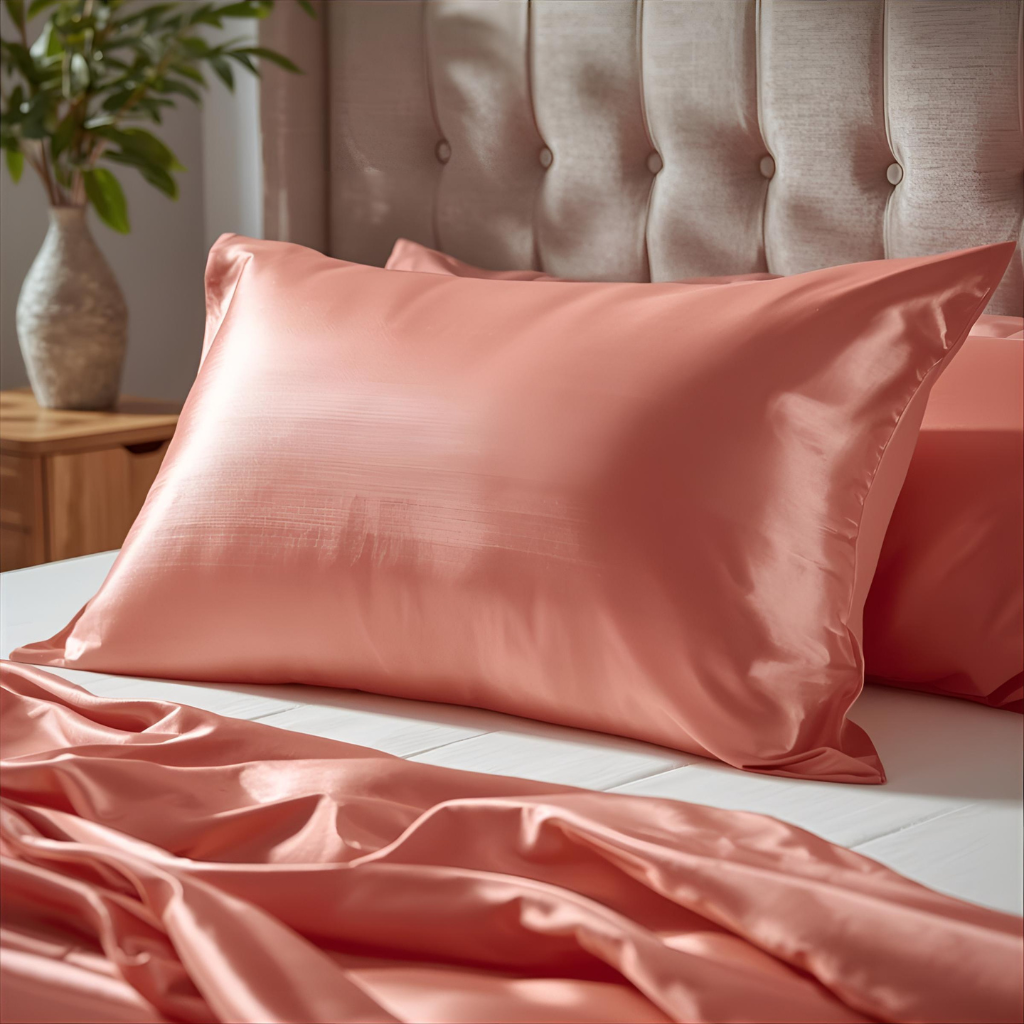 La couleur Coral apporte une douceur visuelle unique : un mélange subtil de rose pêche qui illumine instantanément la chambre. Dès que votre joue se pose sur cette taie d’oreiller en soie 19 momme Coral, vous sentez la glisse fraîche et apaisante de la soie, sans frottement ni marquage.